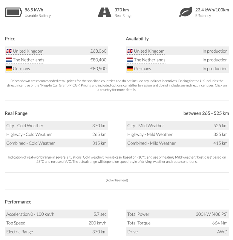 준대형 SUV인 BMW X5 정도의 크기를 갖고 있는 아우디 E-트론 55 콰트로는 전폭 1,938 mm, 전고 1,663 mm에 휠베이스도 2,923 mm 수준으로 성인 5명이 편안하게 탈 수 있는 크기를 확보했다. 배터리를 차체 바닥에 배치해 트렁크 용량도 600 리터 수준을 확보해 적재 능력도 좋다. 최고출력은 408 마력, 최대토크 61.7 kgf.m로 제로백 5.7 초 최고 속도 200km로 파워풀한 주행성능도 갖추고 있다. 문제는 86.5kWh 수준의 배터리로 도심 주행시 유럽기준 주행거리가 370 km 수준으로 모델3 롱레인지나 코나 일렉트릭등 서울에서 부산 까지의 기준인 400 km에는 미치지 못한다. 국내 조건이 유럽보다도 까다롭기 때문에 주행가능 거리는 더 줄어들 수도 있다.